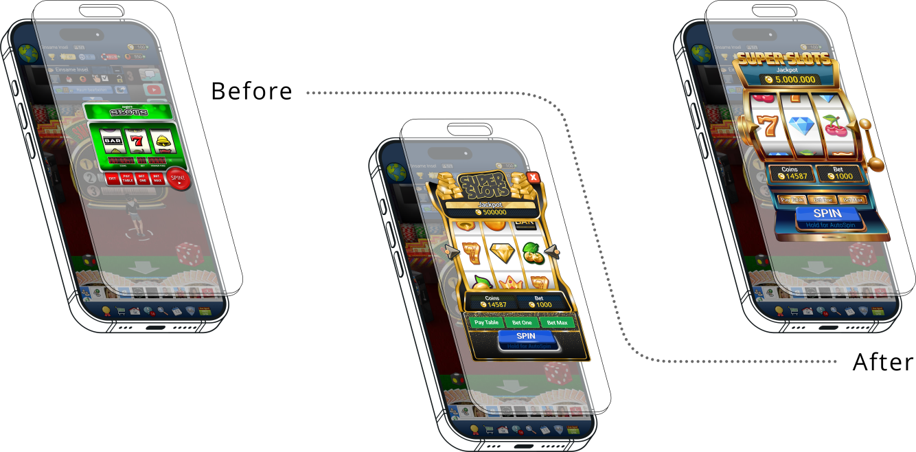 Based on the data analysis of the status quo from user feedback, game analytics, and usability testing data, some important alterations stood out. Users identified the slot machines as unfair, not visually compelling, and no feeling of luxury came up. A changed UI and balancing were able to fix the most significant issues.